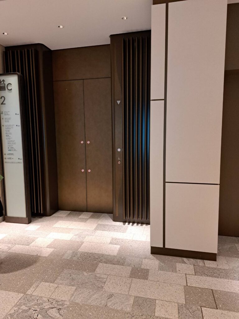 では、車いすユーザー用のエレベーターに乗って入場です。退場の際もこのエレベーターに乗るので、退場時にはスタッフさんにお声がけください。