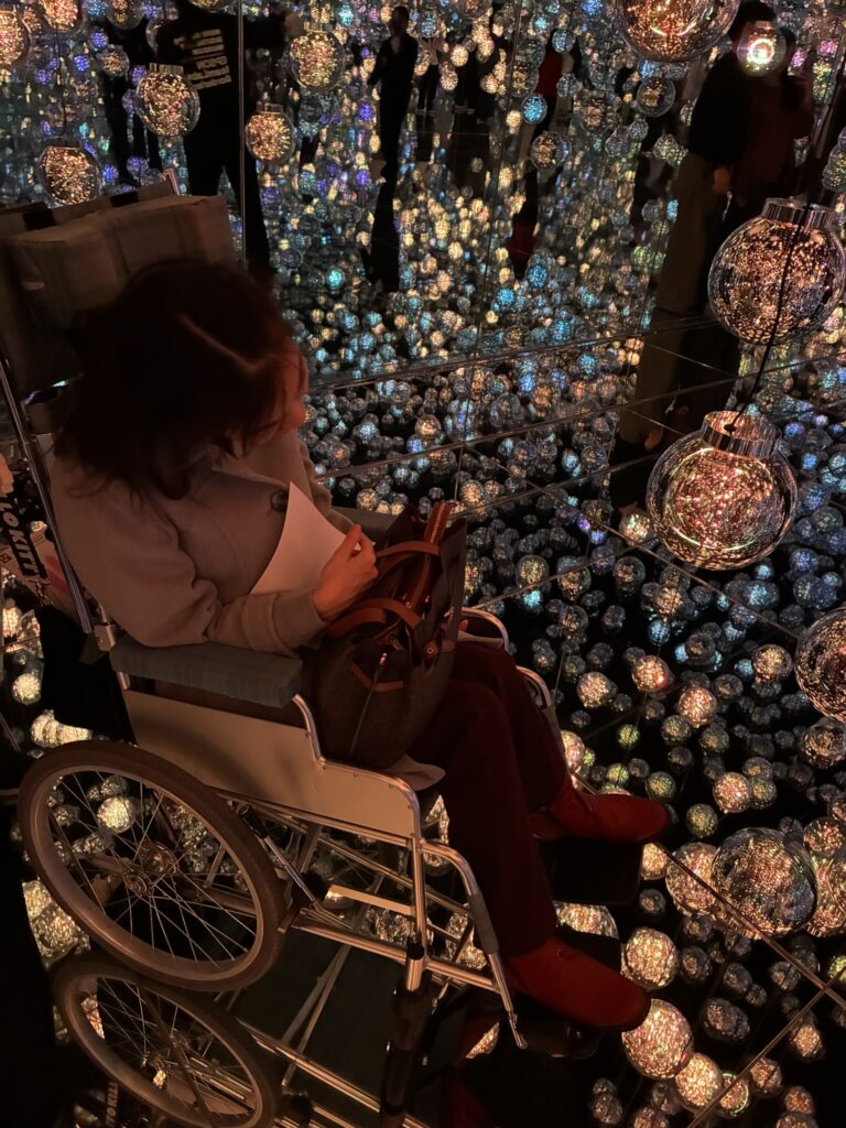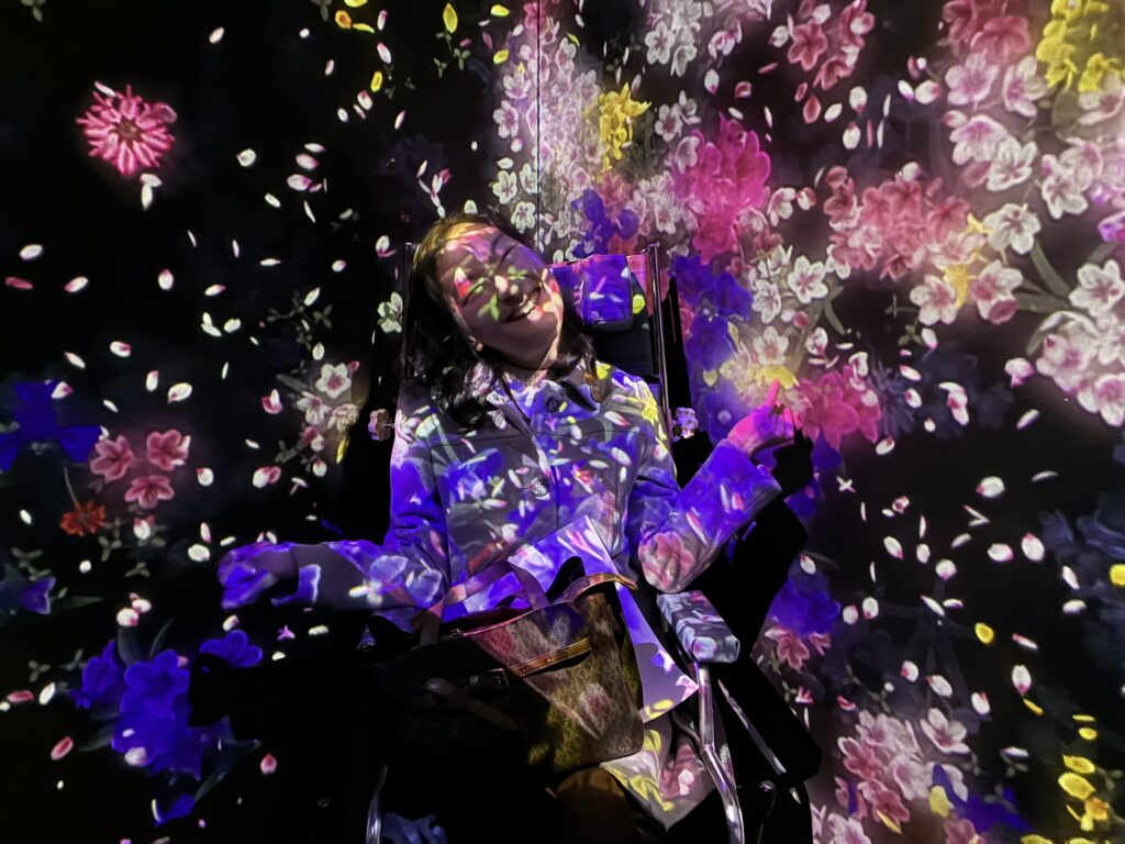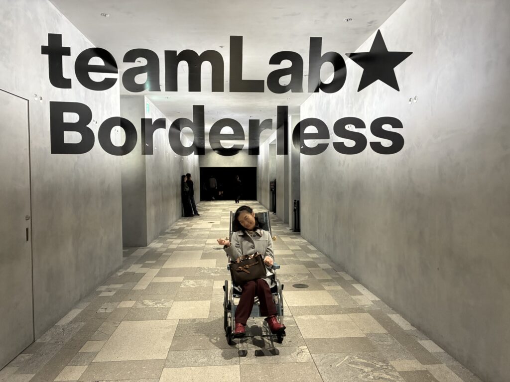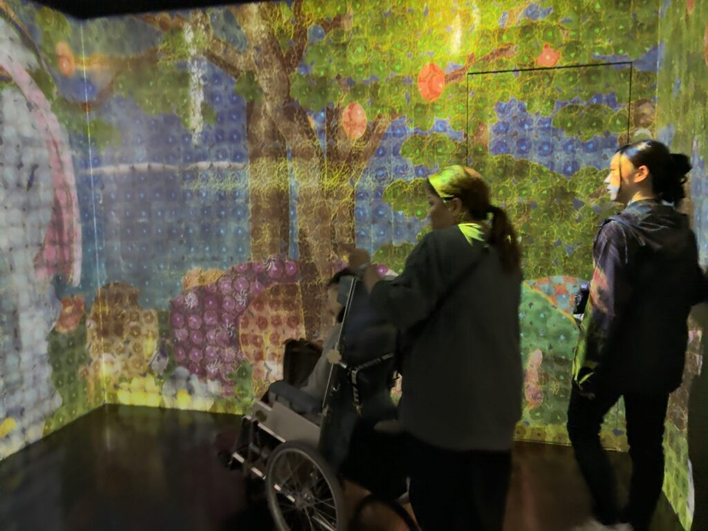 はじめ、車いすユーザーは一般の入口とは異なるエレベーターホールに案内されます。そこで、スタッフさんから一カ所だけ車いすで入場不可なエリアがあるといったご説明を受けます。しかし、結局のところ、どこが入場不可のエリアなのか私たちにはわかりませんでした。というのは、このミュージアムには順路がなく、時間によって同じエリアでも投影演出が異なるため、方向感覚を失ってしまったからです。