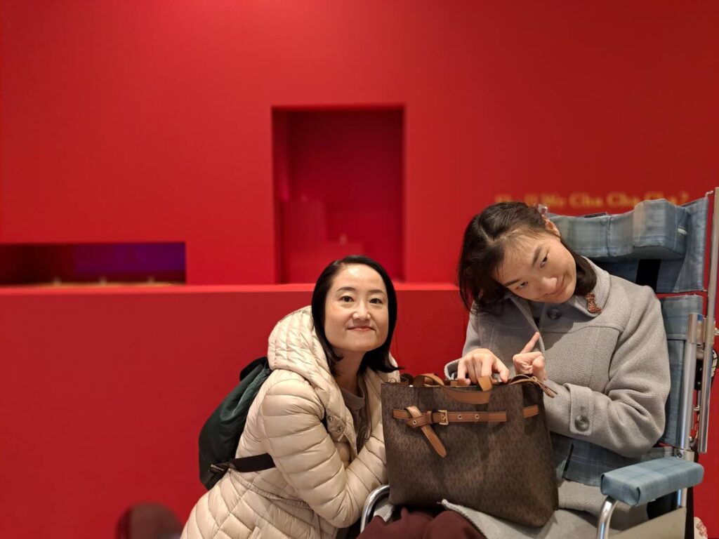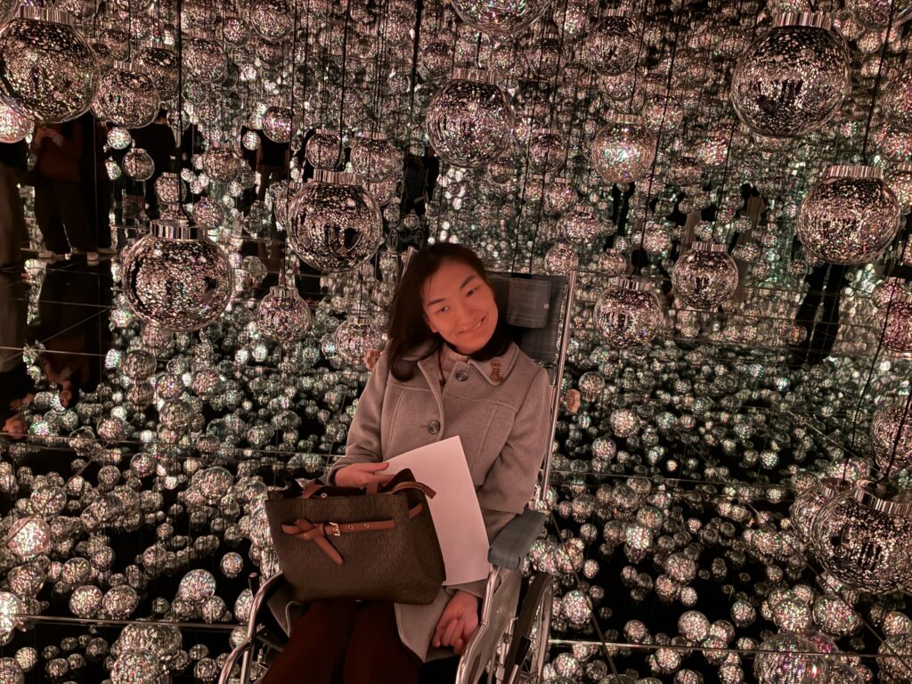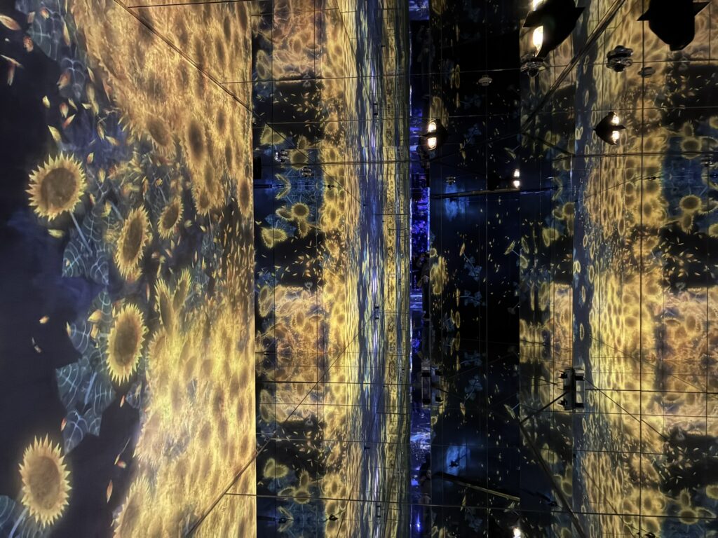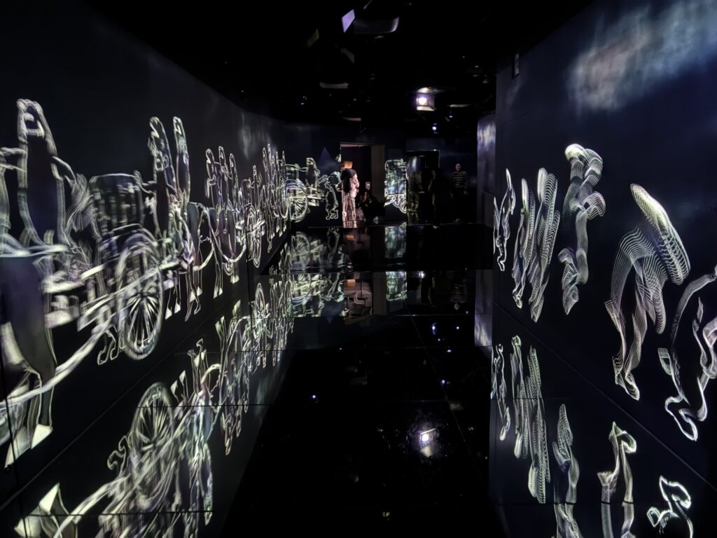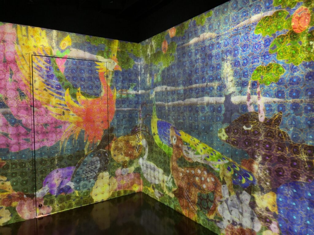 はじめ、車いすユーザーは一般の入口とは異なるエレベーターホールに案内されます。そこで、スタッフさんから一カ所だけ車いすで入場不可なエリアがあるといったご説明を受けます。しかし、結局のところ、どこが入場不可のエリアなのか私たちにはわかりませんでした。というのは、このミュージアムには順路がなく、時間によって同じエリアでも投影演出が異なるため、方向感覚を失ってしまったからです。