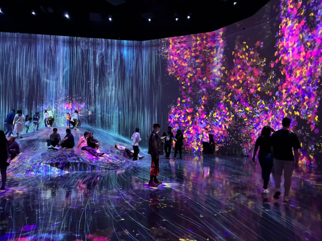 お待ちかねのチームラボです。チームラボは、レーザー光やLED、ミラーを使った投影演出によって、光と映像が空間全体を包み込む没入型デジタルアートを楽しめます。森ビル デジタルアート ミュージアム(ガーデンプラザB地下1階)から入場します。