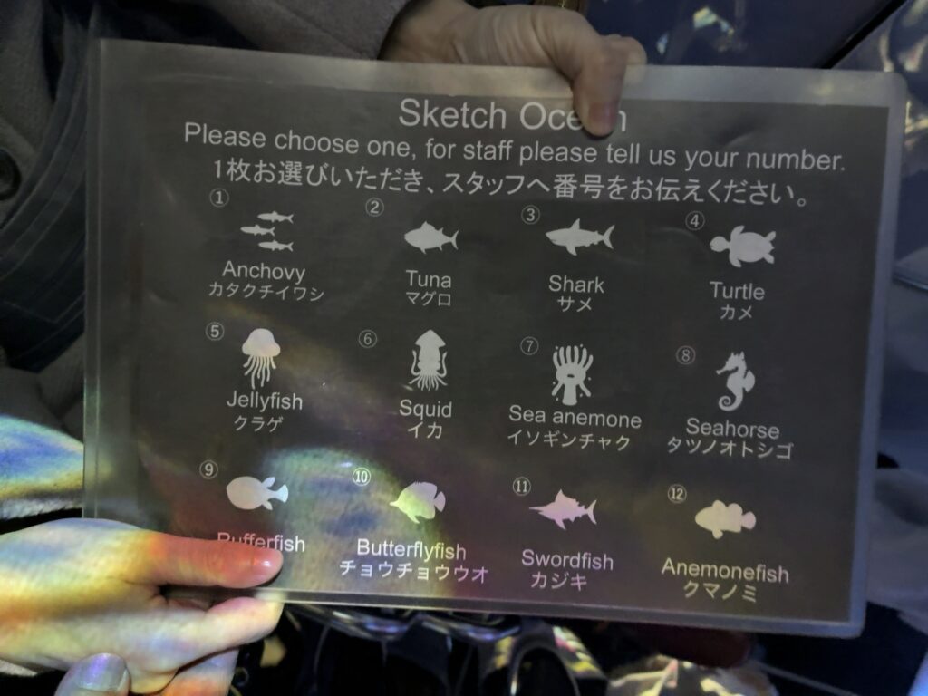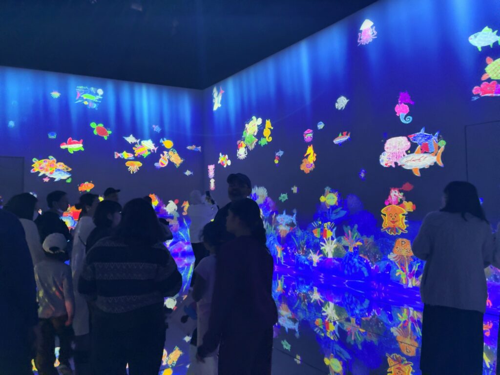 水族館のようなエリアがあり、自分たちで塗り絵をした作品が映像に映し出されるという体験ができます。