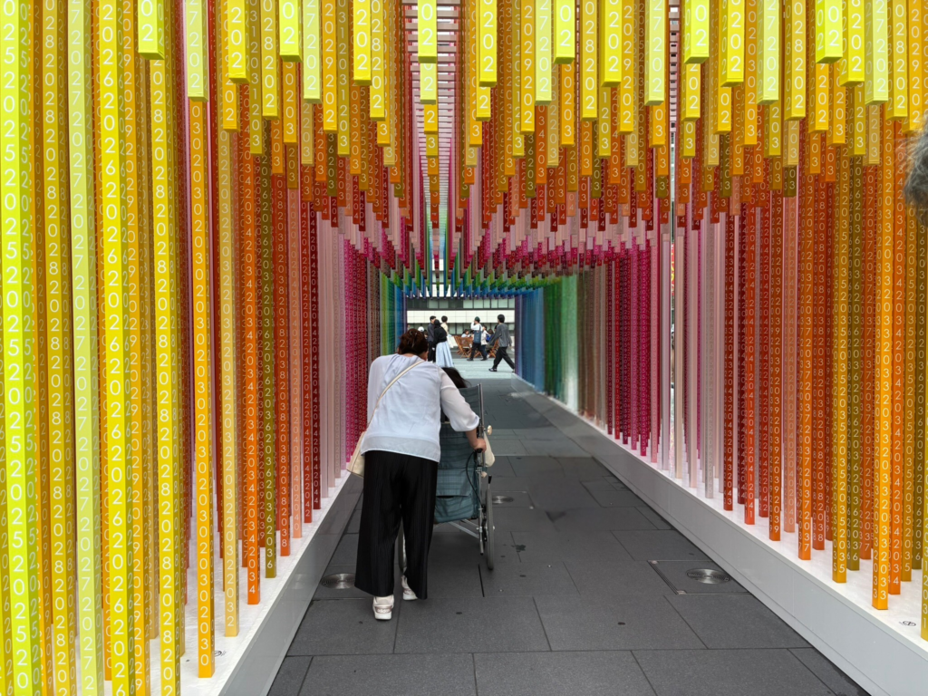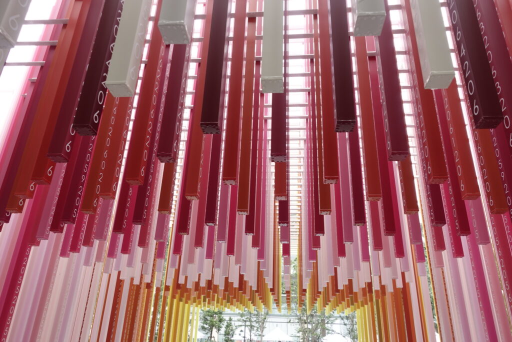 One of the most well-known installations at the time in Gateway Park was an art piece titled “100 colors path” by French architect and designer Emmanuelle Moureaux. Shaped like a tunnel you can walk through, the series of lines forms a gradient of 100 colors—from a front line engraved with “2025” to the farthest one engraved with “2124”—representing the passage of time 100 years into the future. This installation was on display until the 21st of July 2025.
