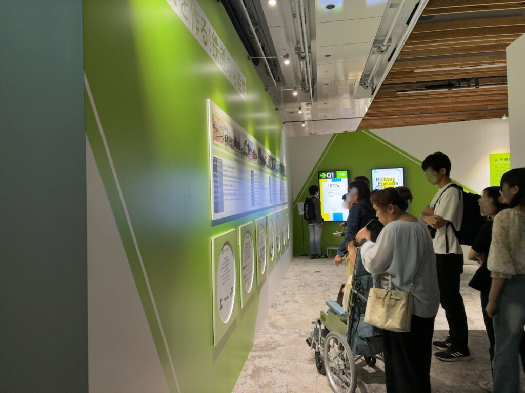 This exhibition introduced the transition of railways from the opening of Japan’s first railway about 150 years ago to the present through videos, photographs and models. The first railway in Japan, which opened in 1872 between Shimbashi and Yokohama, passed along the coastline near Takanawa, making Takanawa a key starting point in the history of railways. Panels and models with such information were placed at heights that were easily visible to wheelchair users.