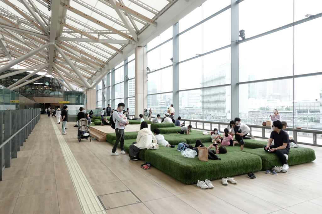 There is a rest area in the passageway that connects the North and South ticket gates. The space feels open and airy. It looked so comfortable that people seemed to forget they were still inside the ticket gates.